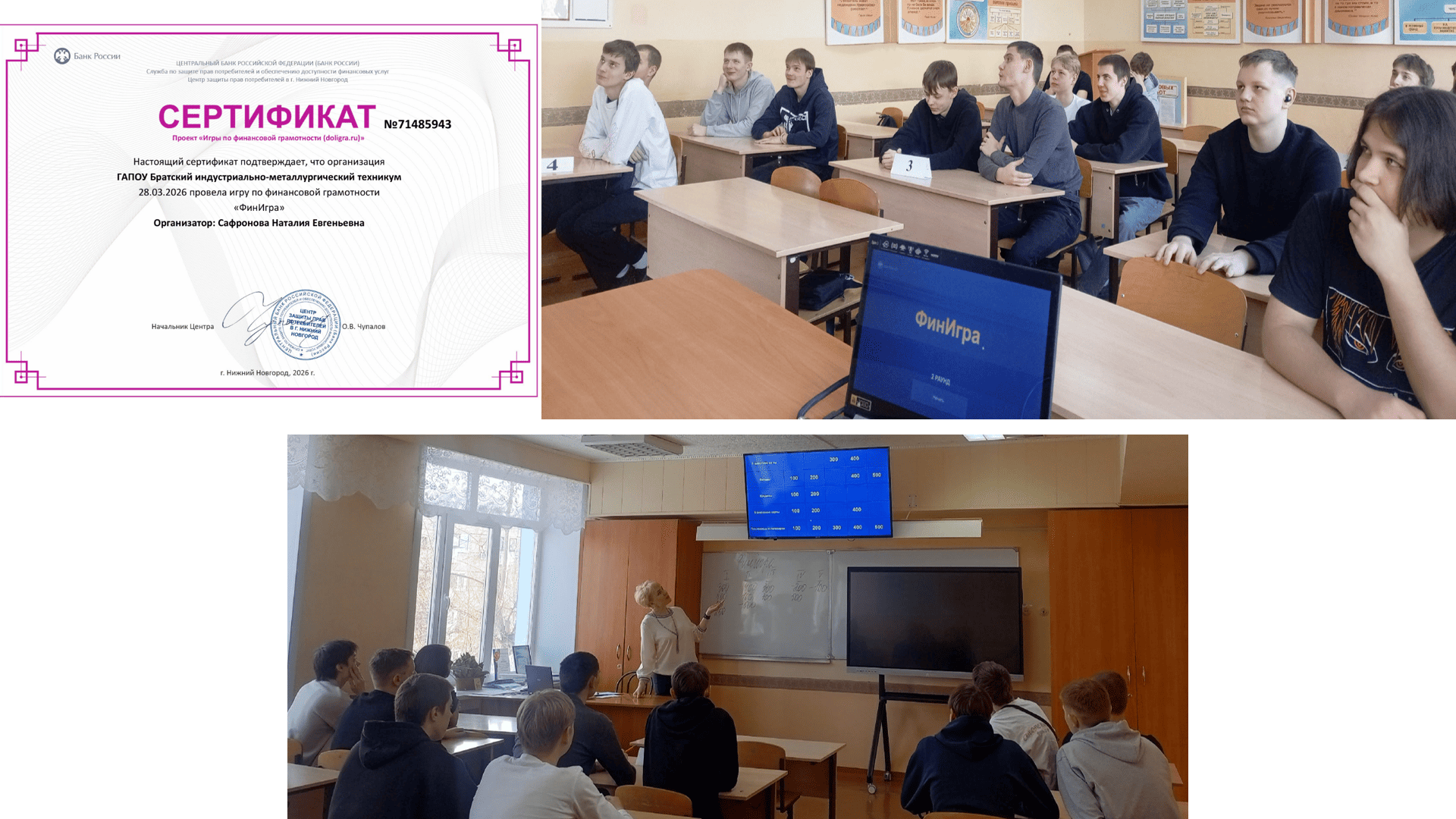 Студенты техникума активно участвуют в «Онлайн-уроках по финансовой грамотности» Банка России под руководством Сафроновой Н.Е., где узнают много интересной и полезной информации. Было получено 65 сертификатов за индивидуальное участие и 2 сертификата за групповое участие (гр. ДО-25 и СВ-24).