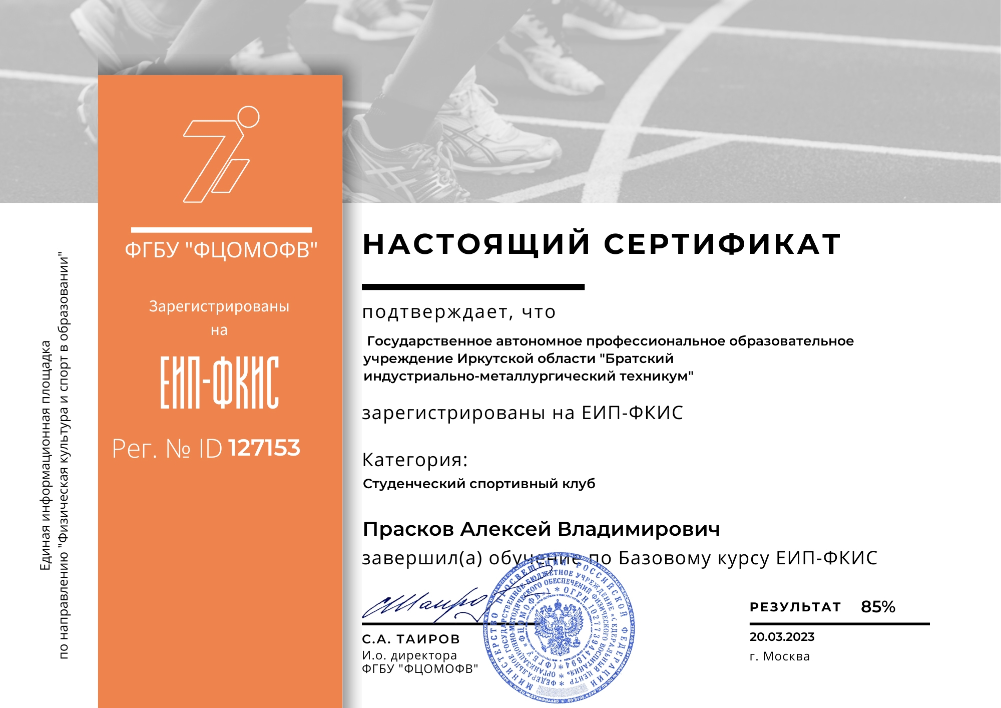Руководитель ССК Прасков Алексей Владимирович прошел обучение по Базовому курсу ЕИП-ФКИС