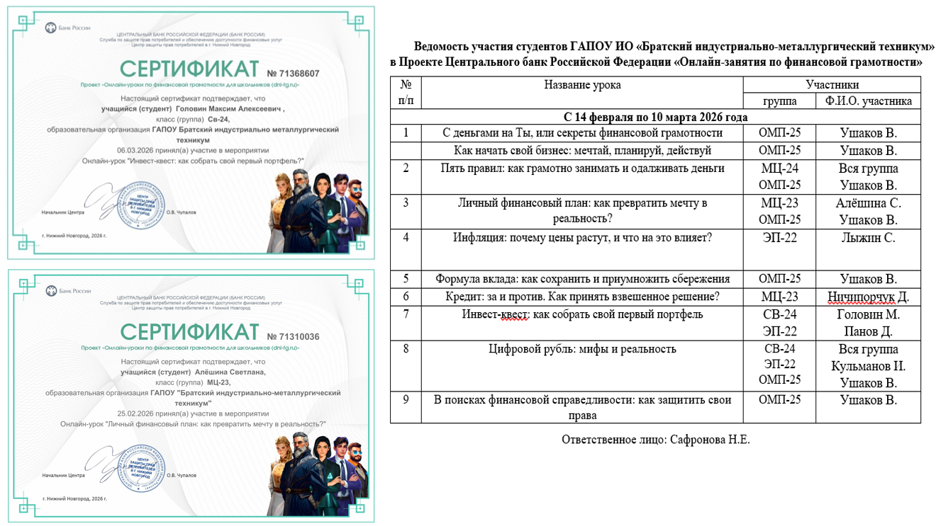 Студенты техникума активно участвуют в «Онлайн-уроках по финансовой грамотности» Банка России под руководством Сафроновой Н.Е и Николаенко Ю.П., где узнают много интересной и полезной информации. Все участники получили сертификаты.