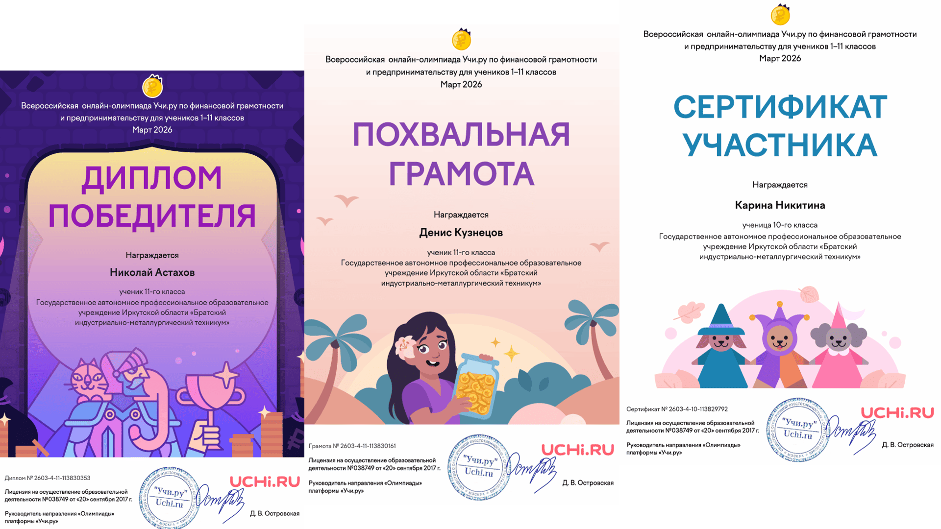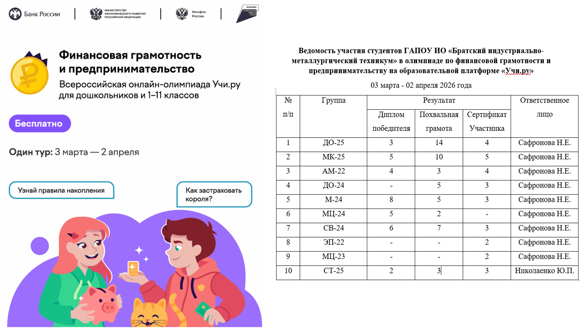 С 03 марта по 02 апреля студенты групп: МЦ-24, М-24, АМ-22, ЭП-22, ДО-24, МК-25, ДО-25, МЦ-23, СТ-25 и СВ-24 под руководством Сафроновой Н.Е. и Николаенко Ю.П. приняли участие в олимпиаде по финансовой грамотности и предпринимательству на образовательной платформе «Учи.ру».