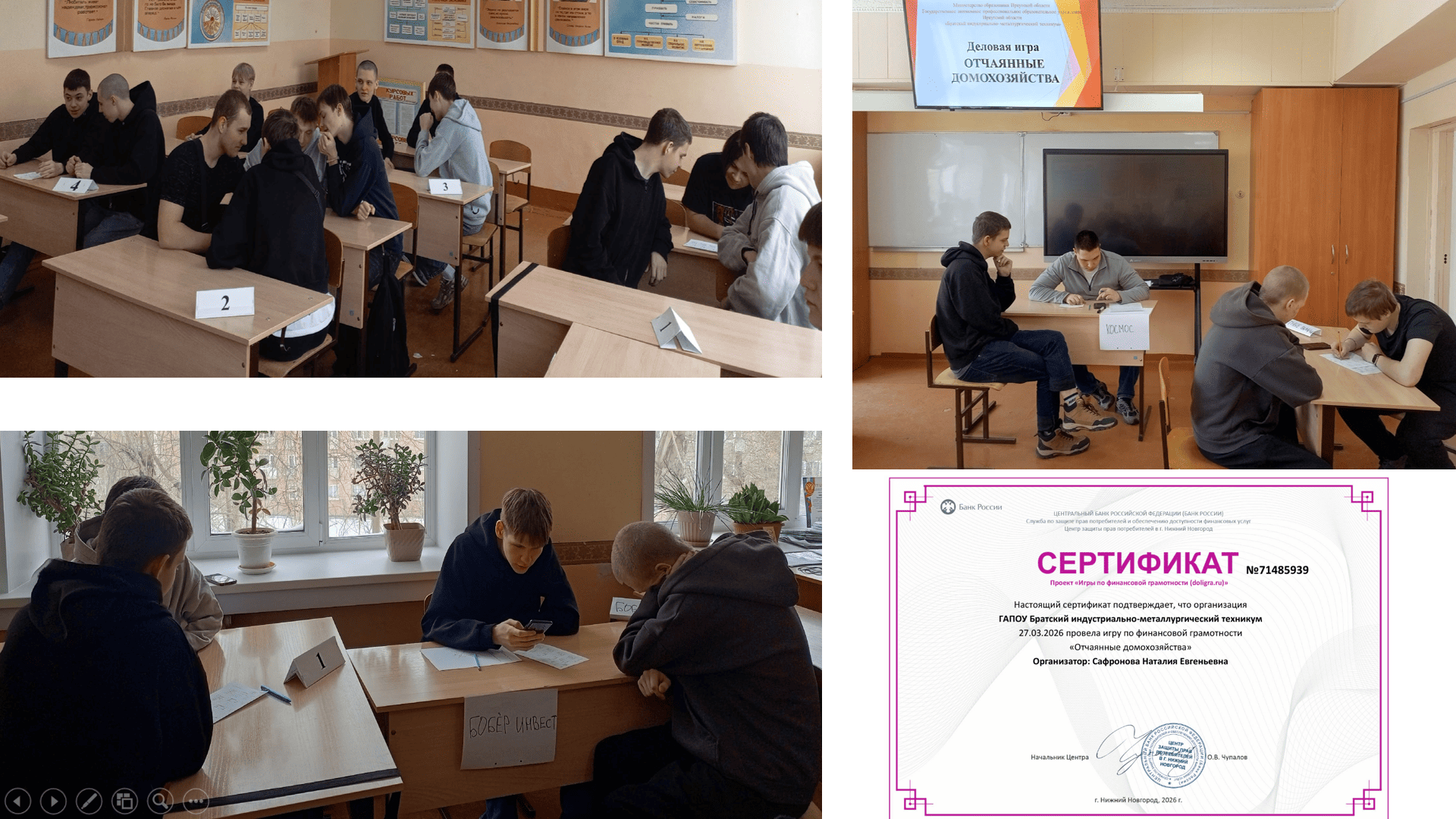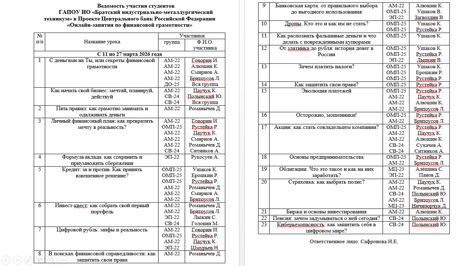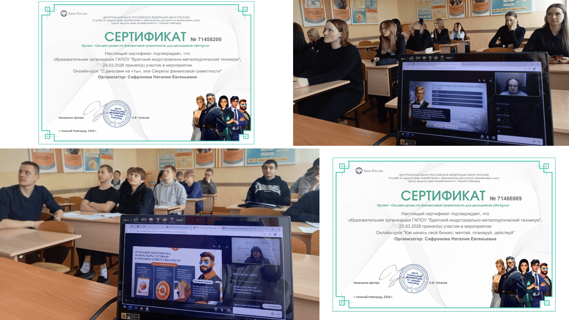 Студенты техникума активно участвуют в «Онлайн-уроках по финансовой грамотности» Банка России под руководством Сафроновой Н.Е., где узнают много интересной и полезной информации. Было получено 65 сертификатов за индивидуальное участие и 2 сертификата за групповое участие (гр. ДО-25 и СВ-24).