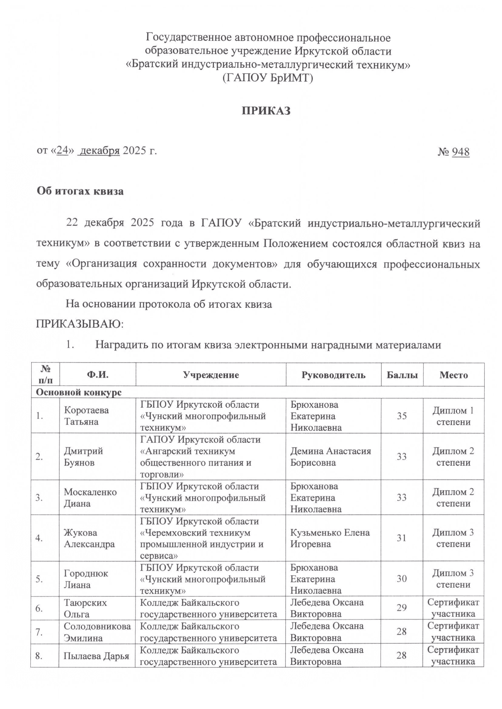 22 декабря 2025 года в Братском индустриально-металлургическом техникуме в рамках популяризации программы «Профессионалитет» успешно прошёл онлайн-квиз «Организация сохранности документов».
